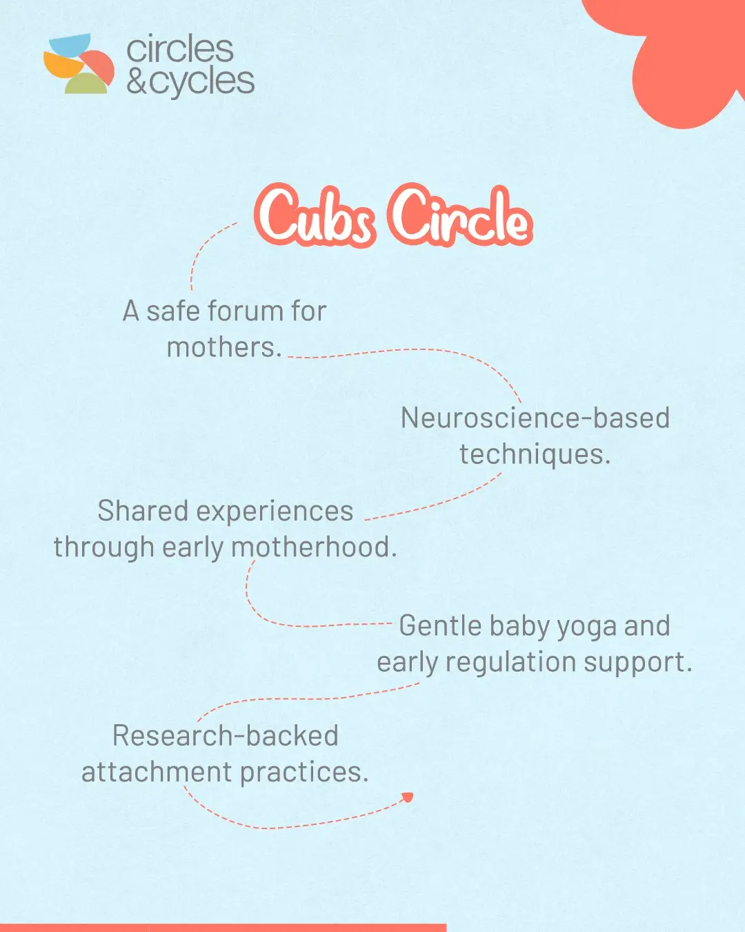 Through connected relational play, baby yoga and movement, and sensory-based experiences, Cubs Circle focuses on the quality of connection between mommy and baby—supporting secure attachment, emotional regulation, and early bonding.